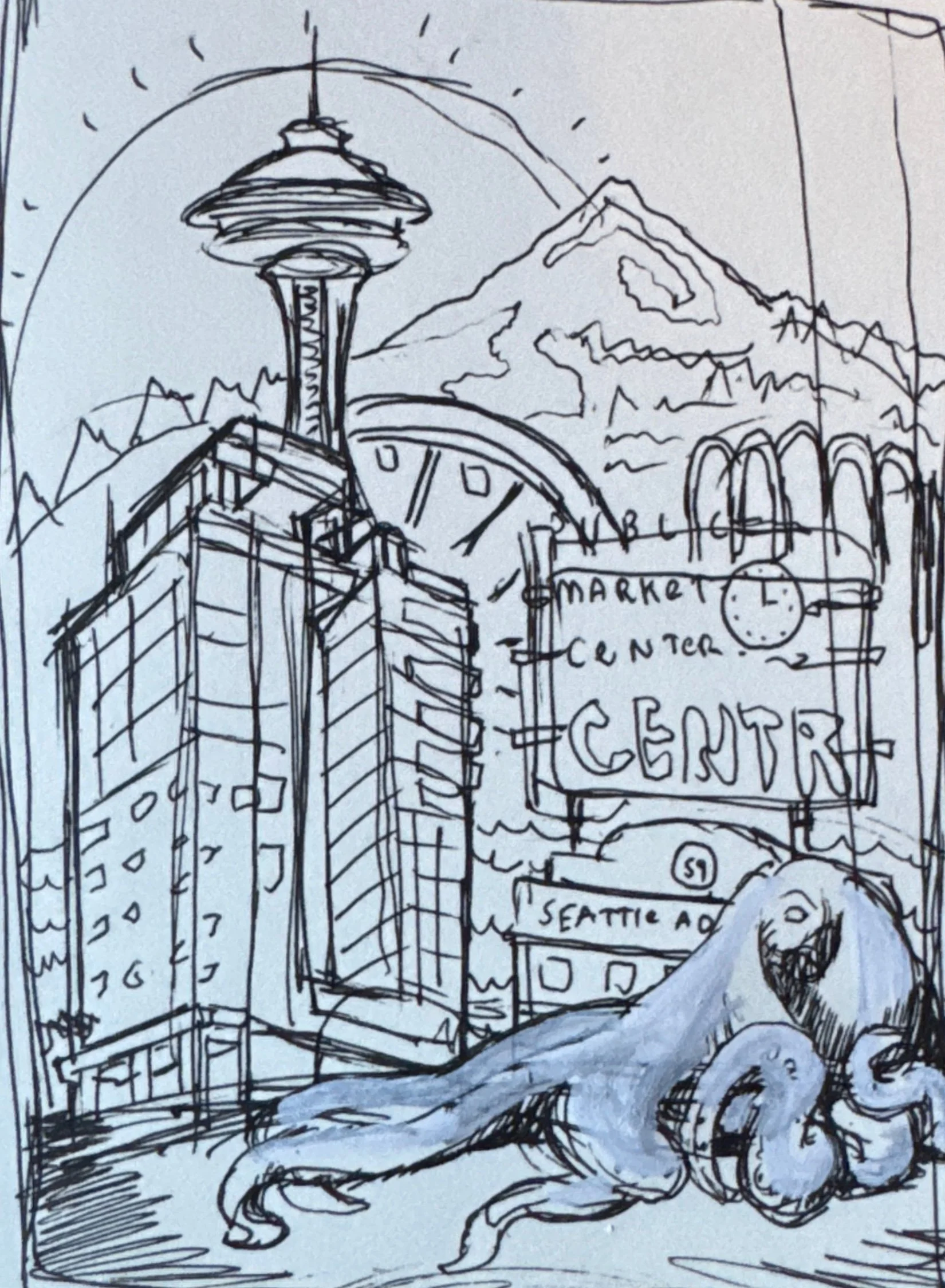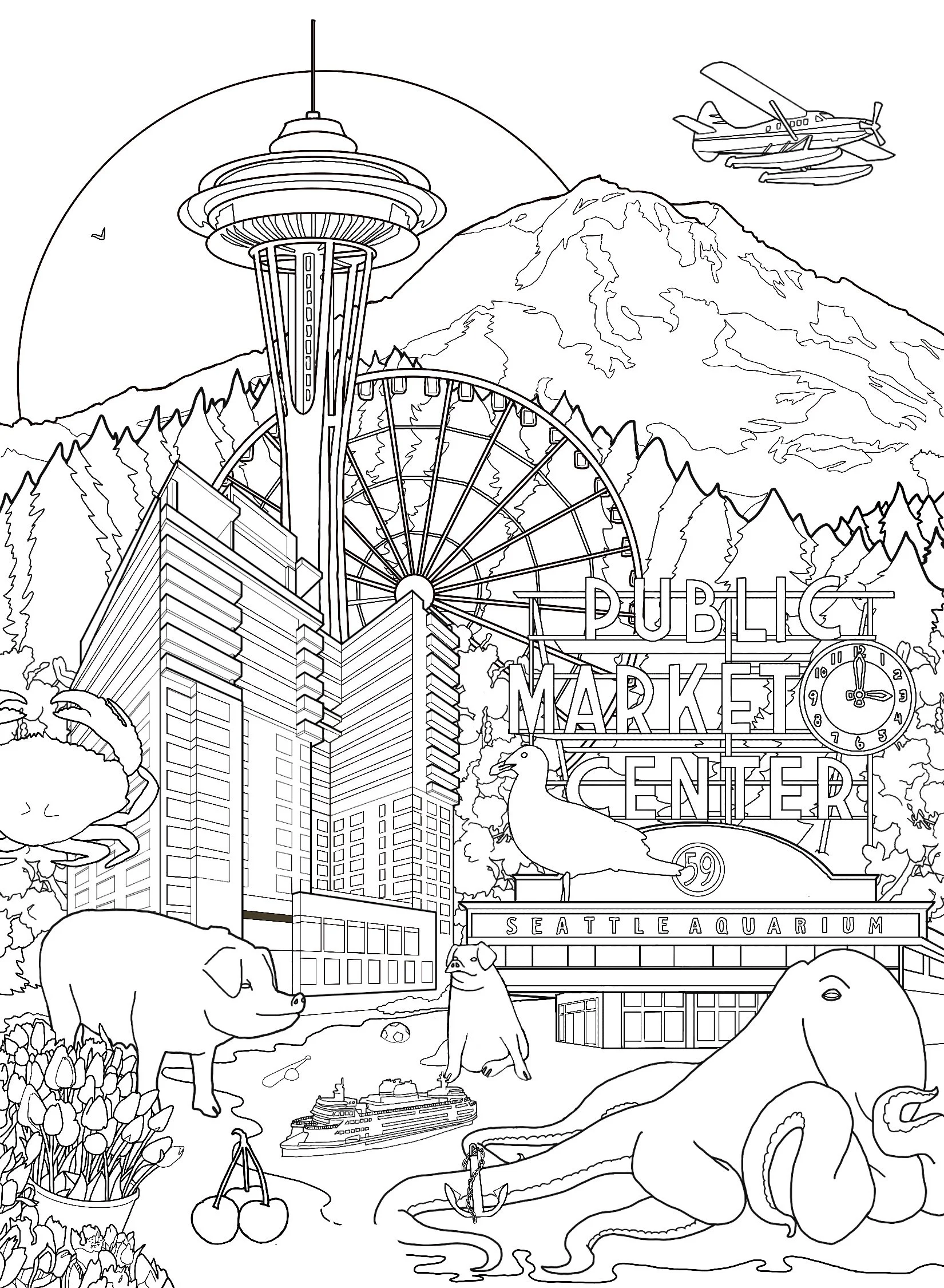 ILLUSTRATION: Every image in the book is original illustration. The cover spread shows Seattle as a child would want to see it (the Space Needle rising above Pike Place Market, a Washington State Ferry crossing the sound, the Olympic Mountains in the background) everything bathed in warm afternoon light. It is a love letter to the city that works for a guest who has never been here and for a Seattle local who has seen it a hundred times.